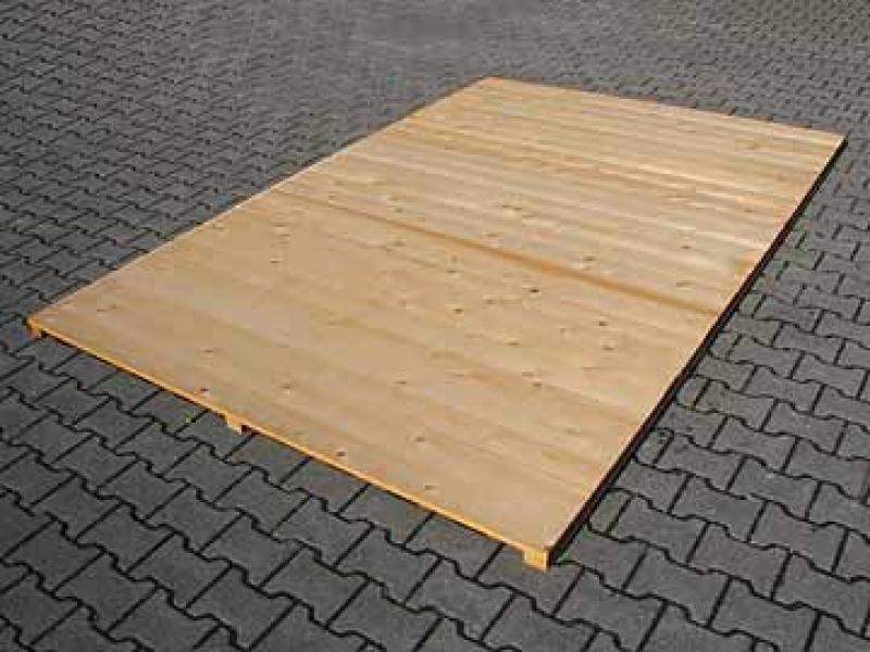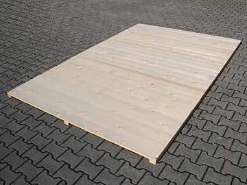 Fußboden aus 22 mm starken nordischen Nut- und Federbrettern, gehobelt, auf stabiler Holzunterkonstruktion, unbehandeltDie Lieferung erfolgt in montagefertigen Elementen.