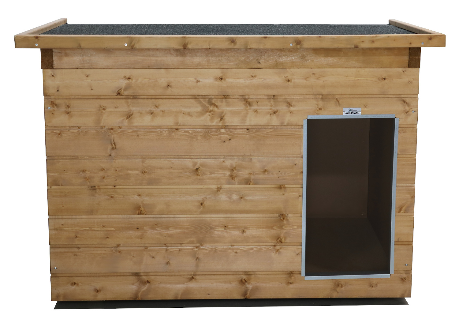 Original SAUERLAND Holz-Hundehütte, braun imprägniert | Pultdach Allwetter | Eingang Längsseite | Größe Dino