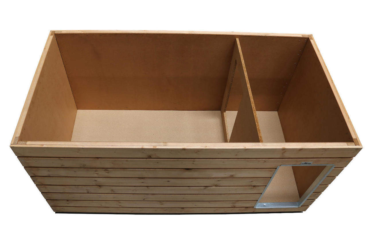 Voll-isolierte Hundehütte aus Holz mit Vorraum als Windfang und abnehmbarem Dach. Bausatz aus montagefertigen Elementen, schnell aufzubauen.