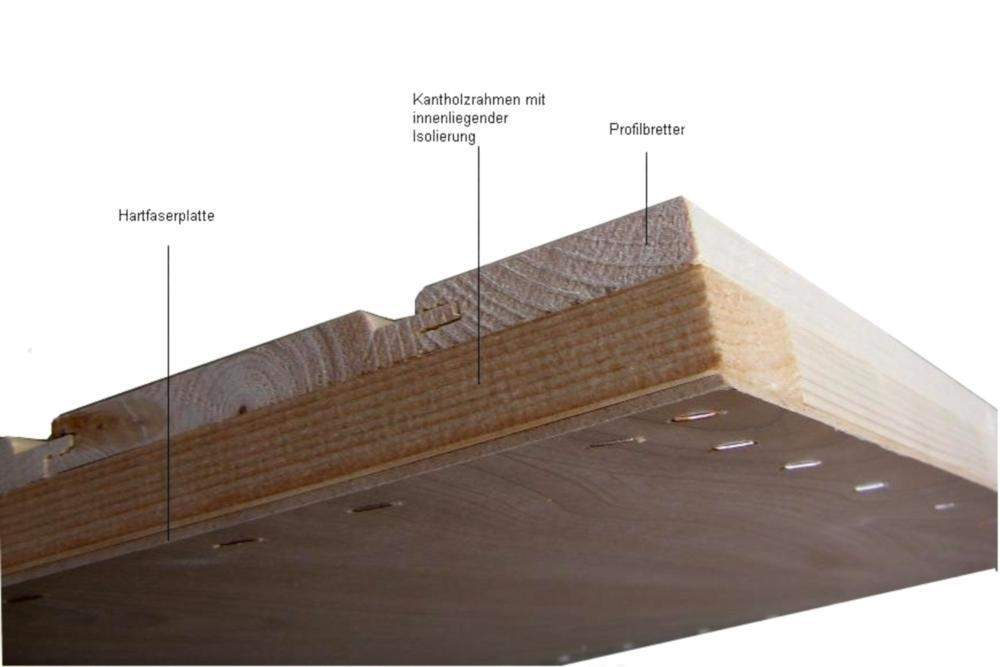 - Wandaußenseiten: 14 mm starke Nut- und Feder Profilbretter aus nordischer Fichte, braun imprägniert.