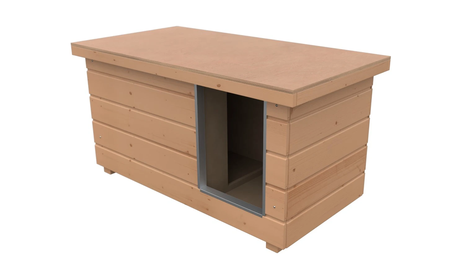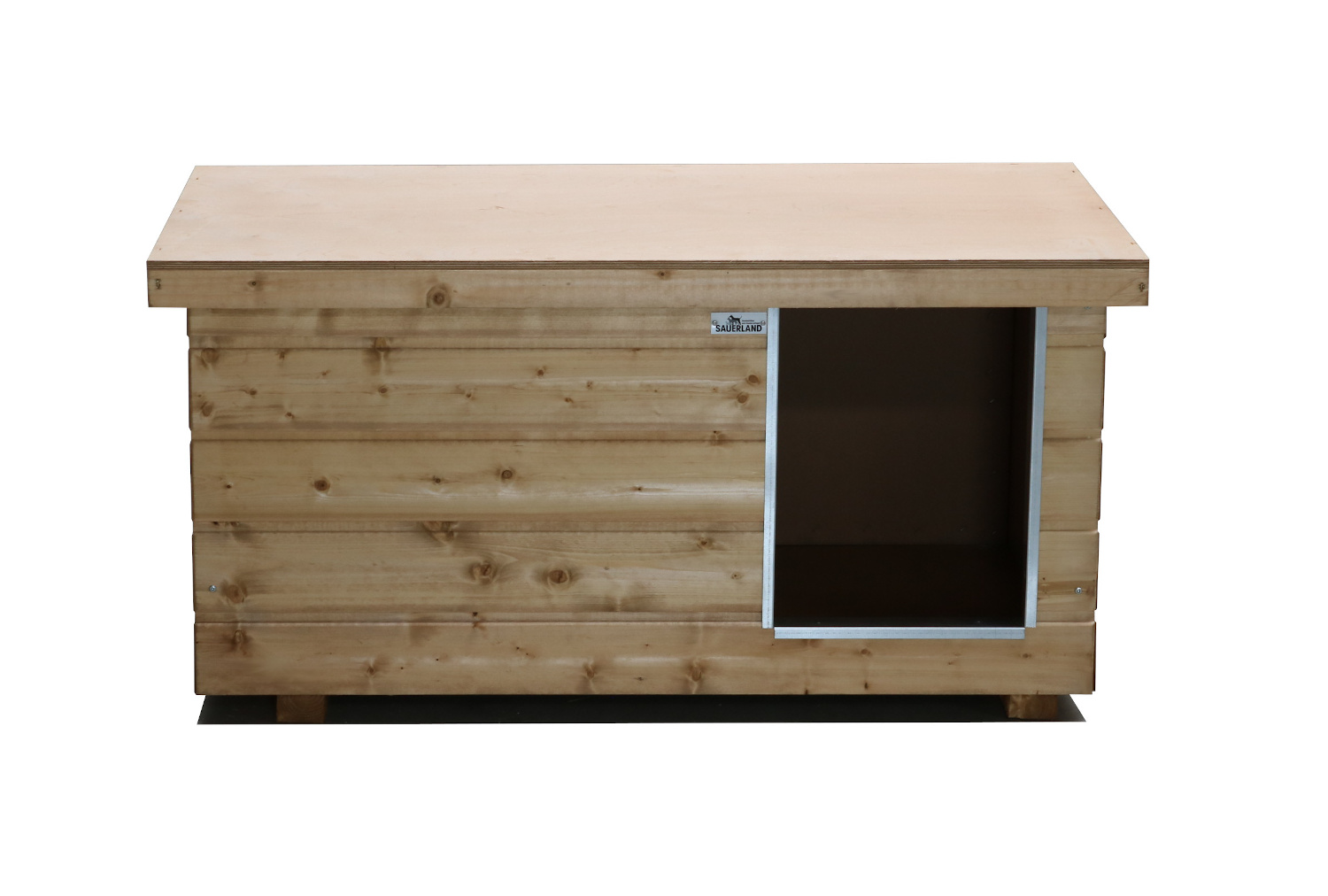 Original SAUERLAND Holz-Hundehütte mit Vorraum, braun imprägniert | Flachdach | Eingang Längsseite | Größe Napoleon