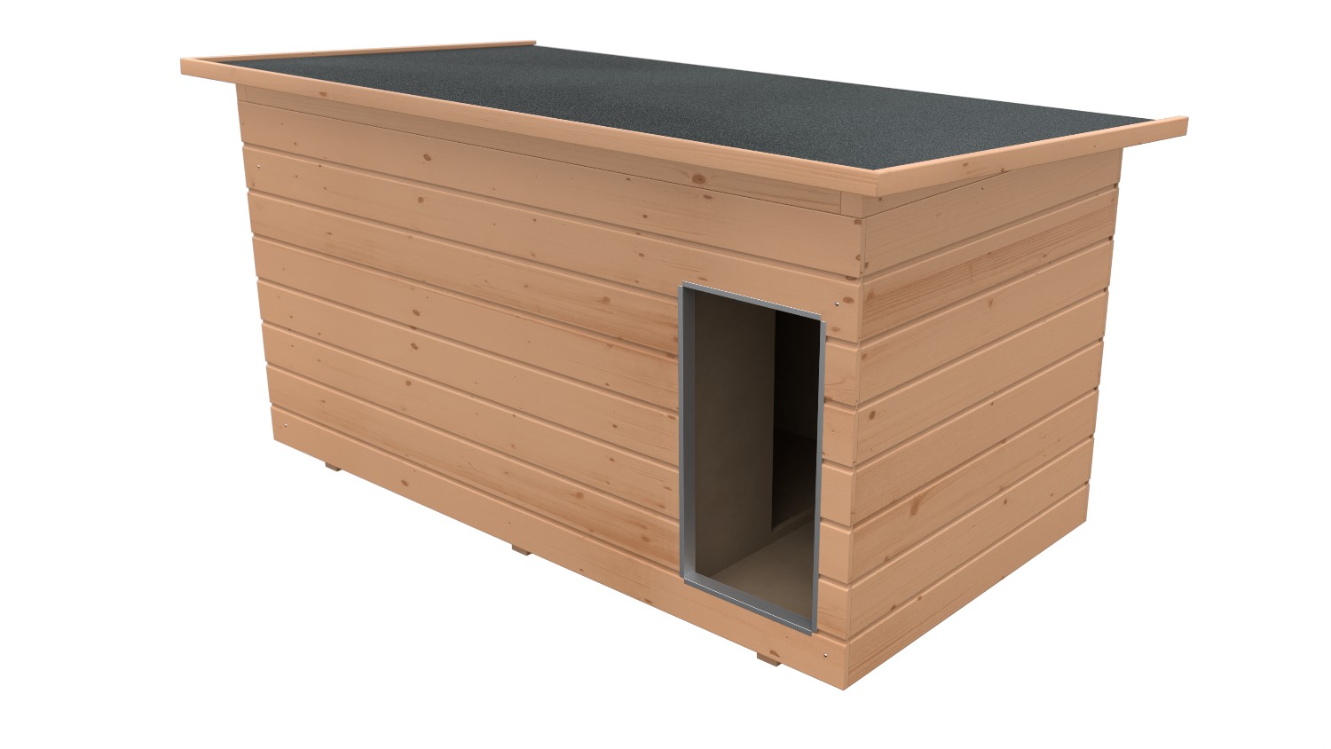 Voll-isolierte Hundehütte aus Holz mit abnehmbarem Dach. Bausatz aus montagefertigen Elementen, schnell aufzubauen.