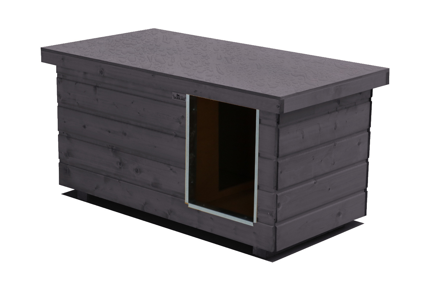 Original SAUERLAND Holz-Hundehütte mit Vorraum, graphitgrau | Flachdach Dickschicht | Eingang Längsseite | Größe Napoleon