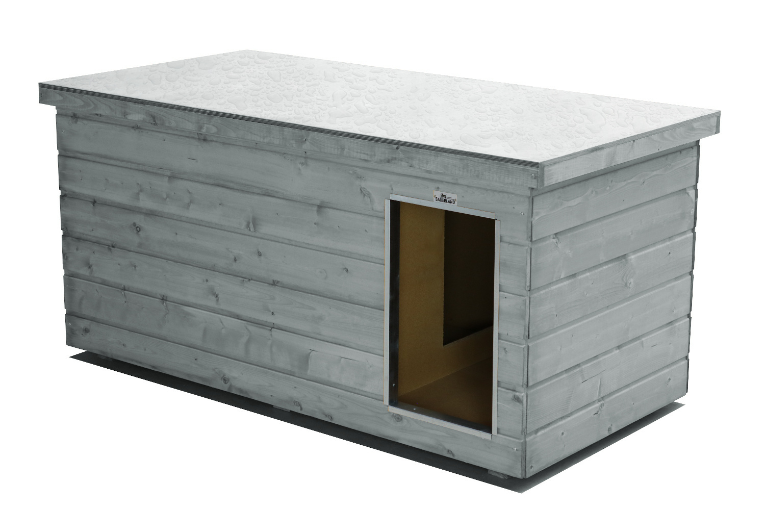 Voll-isolierte Hundehütte aus Holz mit Vorraum als Windfang und abnehmbarem Dach. Bausatz aus montagefertigen Elementen, schnell aufzubauen.