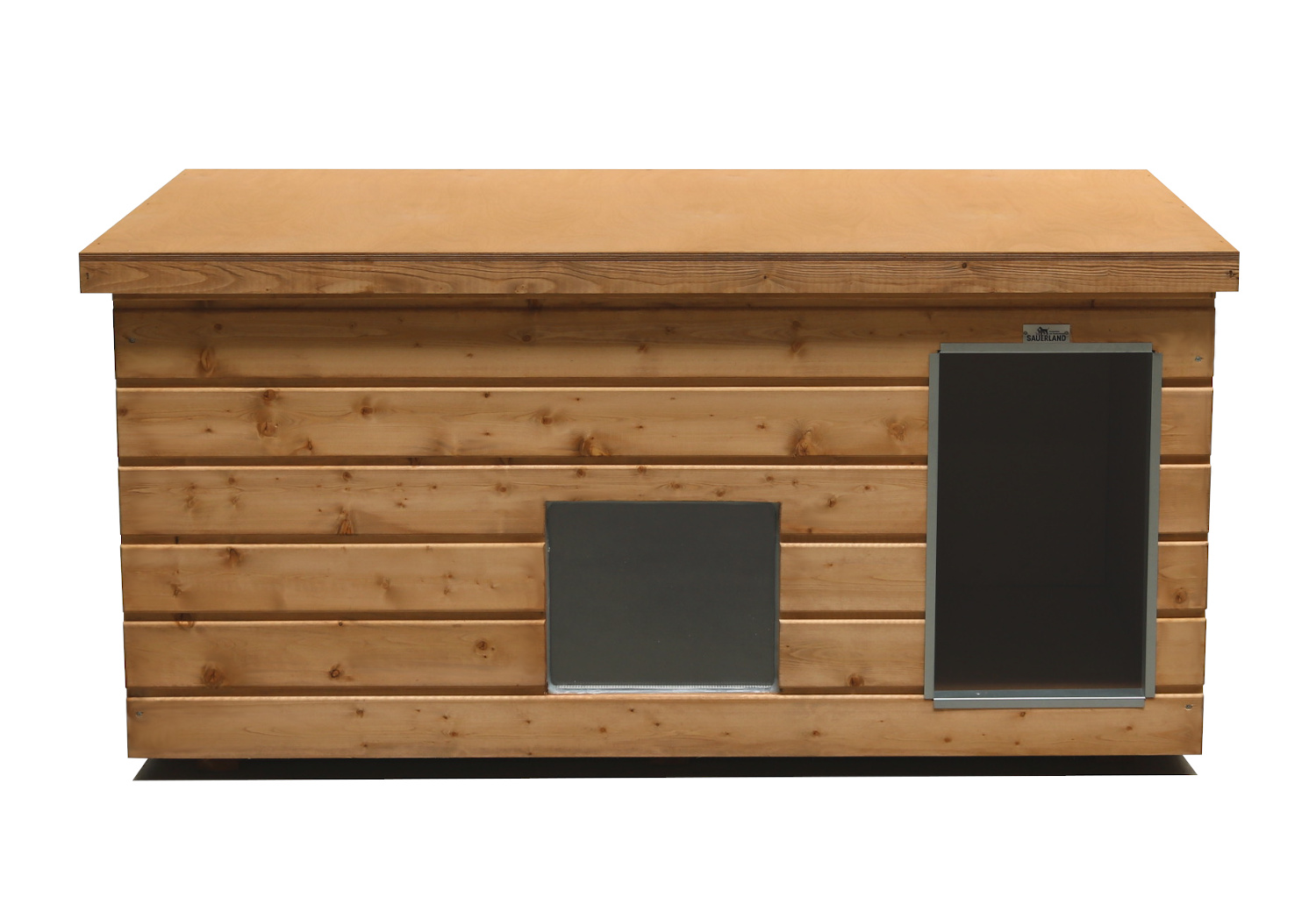 Original SAUERLAND Holz-Hundehütte mit Vorraum und Fenster, braun imprägniert | Flachdach | Eingang Längsseite | Größe Lassie