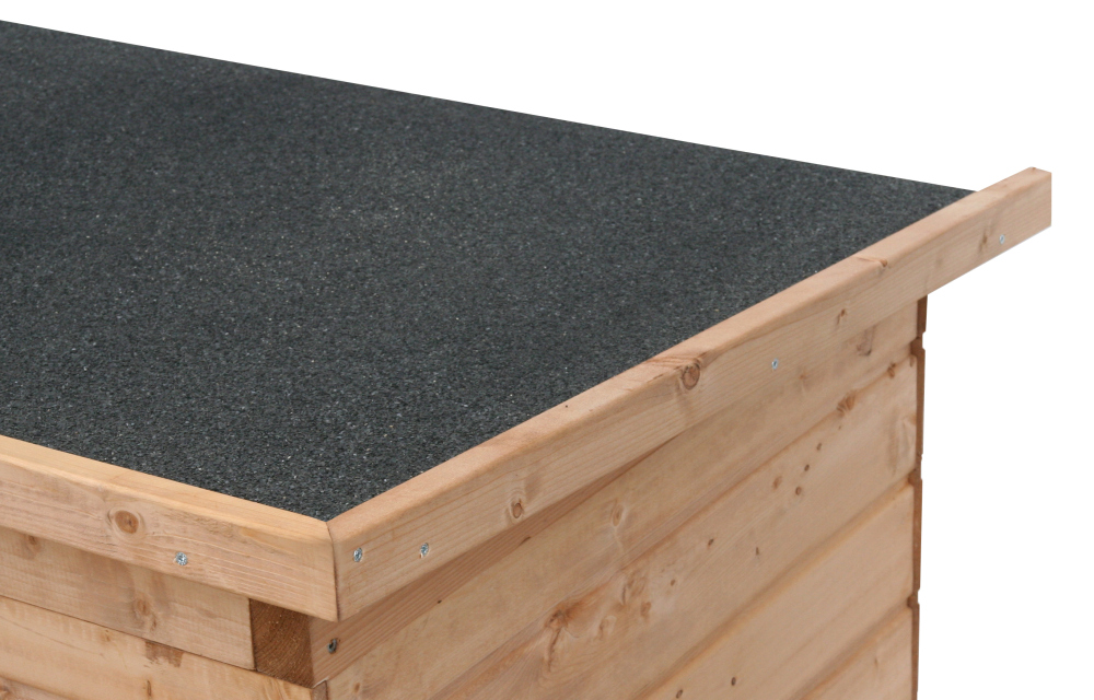 - Dach: abnehmbar, mit schiefersplittbeschichteter Glasfaser-Bitumenbahn dauerhaft gedeckt. Dachkanten werden von einem Massivholzrahmen eingefasst.