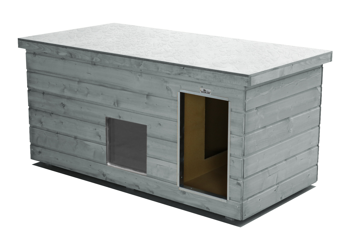 Original SAUERLAND Holz-Hundehütte mit Vorraum und Fenster, platingrau | Flachdach Dickschicht | Eingang Längsseite | Größe Lassie