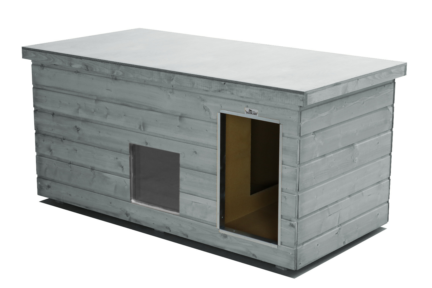 Voll-isolierte Hundehütte aus Holz mit Vorraum, Fenster und abnehmbarem Dach. Bausatz aus montagefertigen Elementen, schnell aufzubauen.