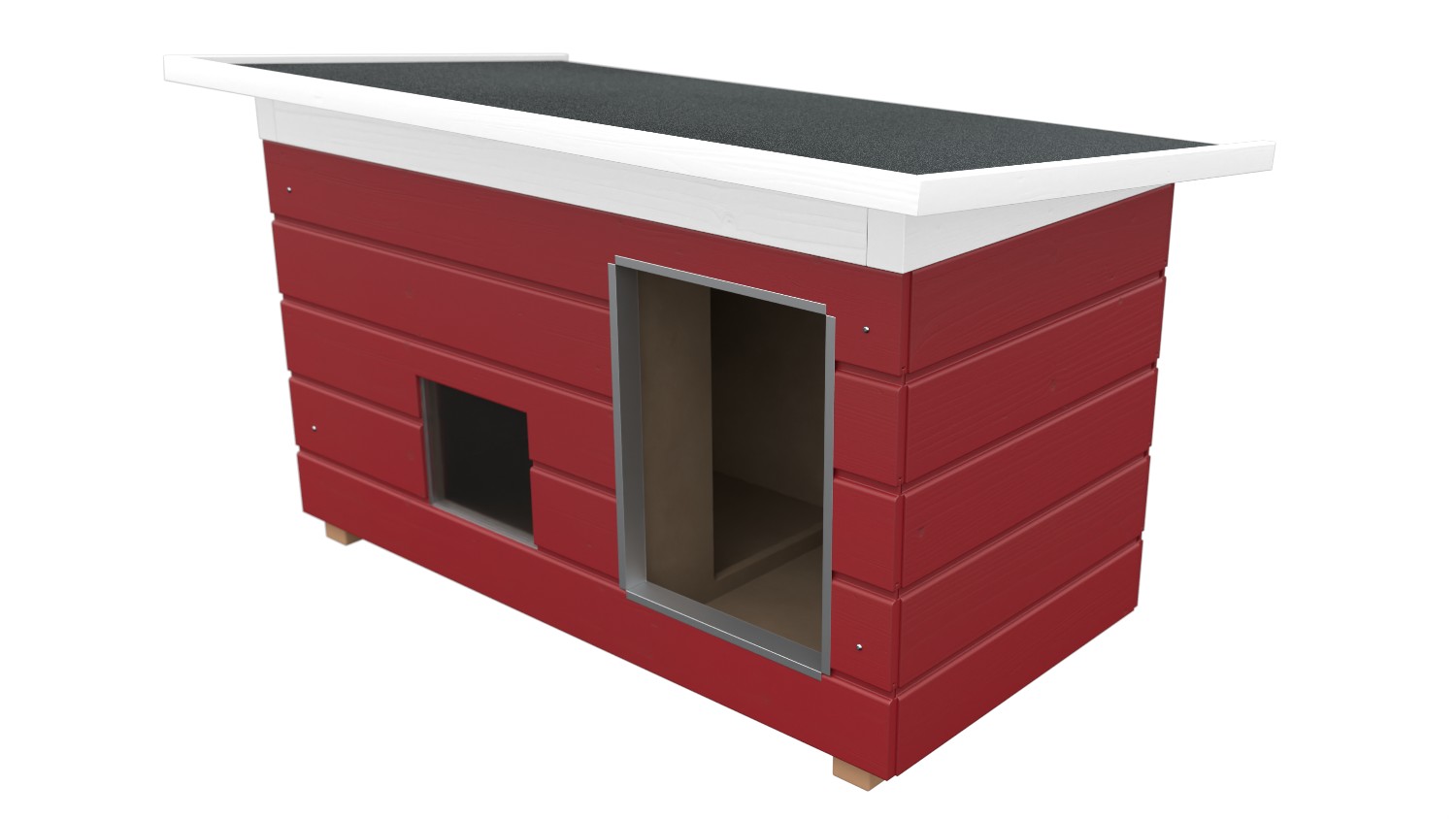 Voll-isolierte Hundehütte aus Holz mit abnehmbarem Dach. Bausatz aus montagefertigen Elementen, schnell aufzubauen.