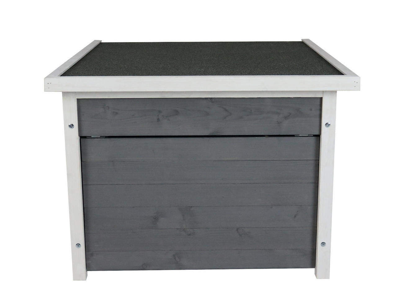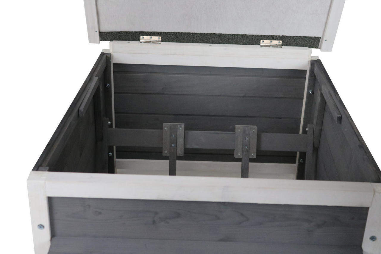 Das Holzhaus ist fertig lasiert in einem grauen Farbton mit weißen Absetzungen. Das Dach ist mit einem verschweißten Bitumenbelag versehen und somit wetterfest. Es lässt sich von vorn komplett aufklappen.