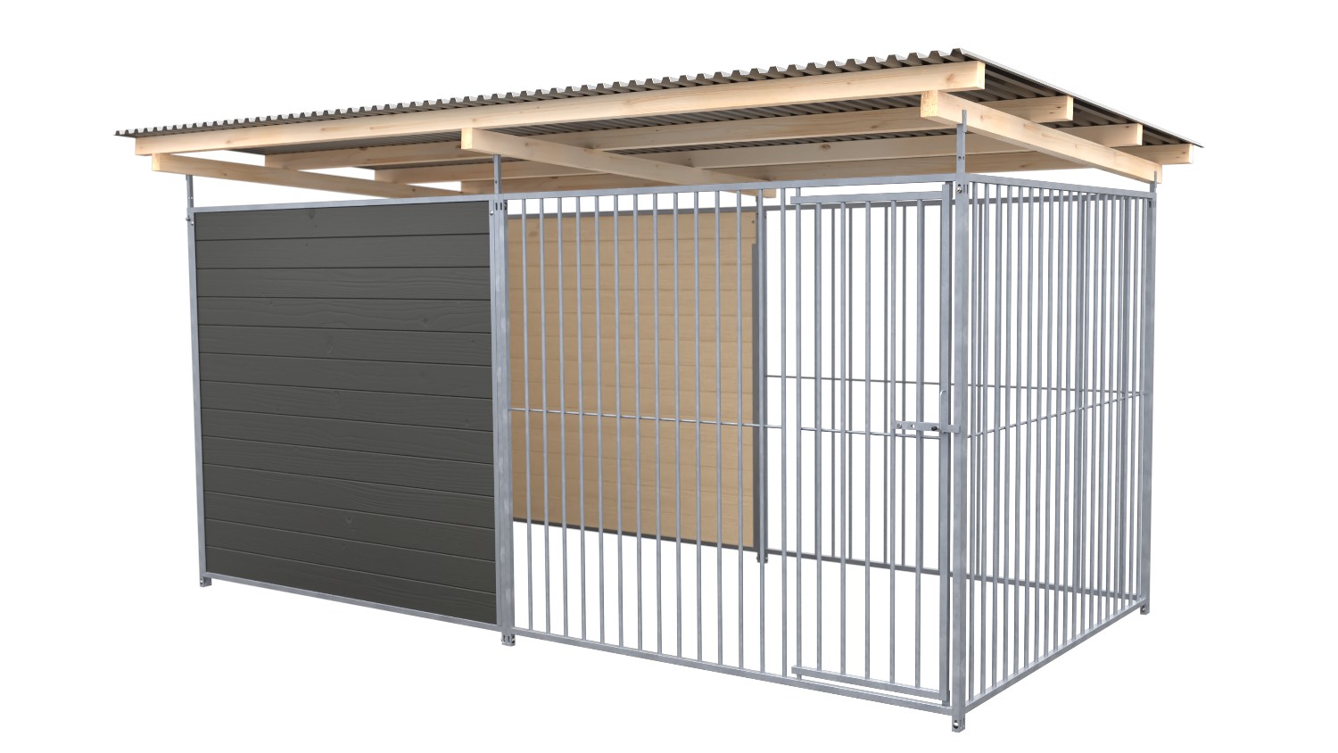 Mit seiner Kombination von geschlossenen Holzelementen und offenen Metallelementen bietet dieser Zwinger Ihrem Hund sowohl einen geschützten Raum als auch einen Auslauf mit ungehindertem Ausblick nach drei Seiten.
