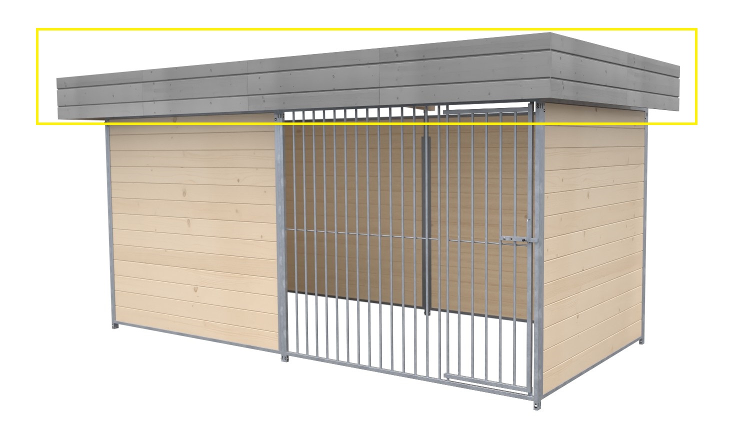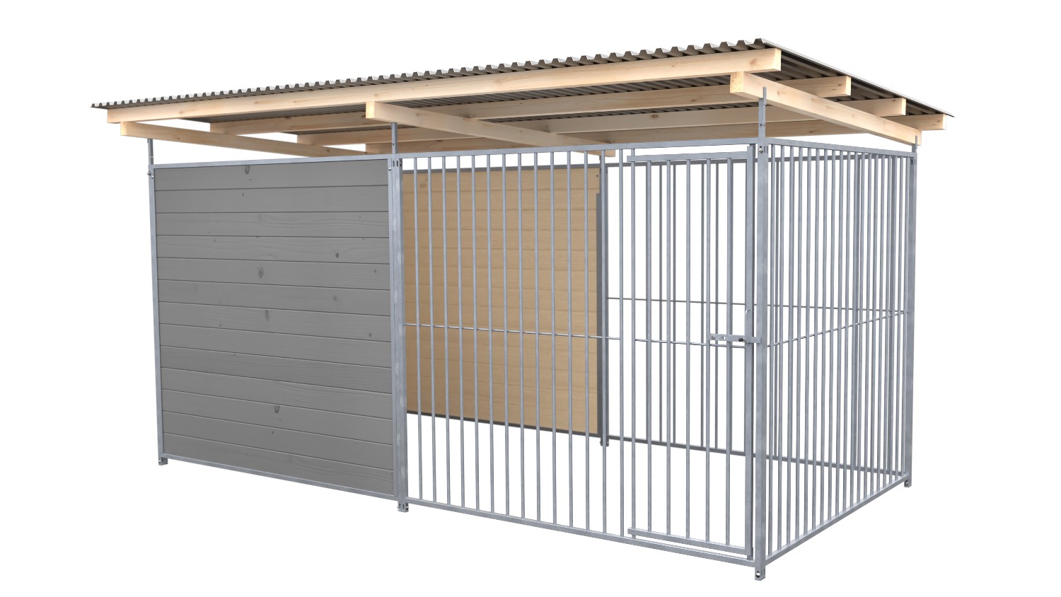 Mit seiner Kombination von geschlossenen Holzelementen und offenen Metallelementen bietet dieser Zwinger Ihrem Hund sowohl einen geschützten Raum als auch einen Auslauf mit ungehindertem Ausblick nach drei Seiten.