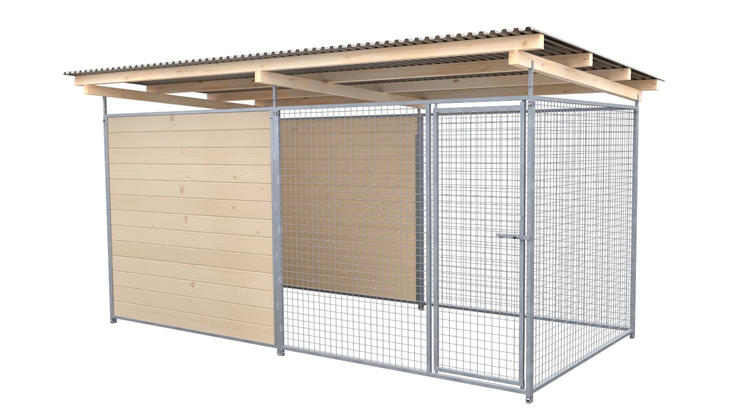 Mit seiner Kombination von geschlossenen Holzelementen und offenen Metallelementen bietet dieser Zwinger Ihrem Hund sowohl einen geschützten Raum als auch einen Auslauf mit ungehindertem Ausblick nach drei Seiten. Das naturbelassene Holz der geschlossenen Elemente können Sie nach Geschmack farblich behandeln.