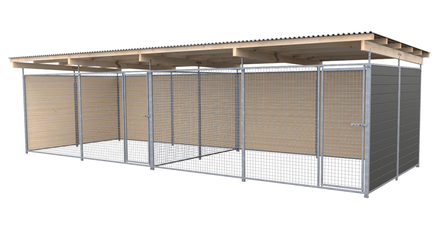 Die Frontseite dieses Schutzzwingers ist mit Gitter-Elementen versehen. So haben Ihre Hunde freie Sicht nach vorn, während sie durch die geschlossenen Elemente an den Seiten und der Rückseite gut geschützt sind. Die Trennwand ist standardmäßig als Gitter-Element ausgeführt.