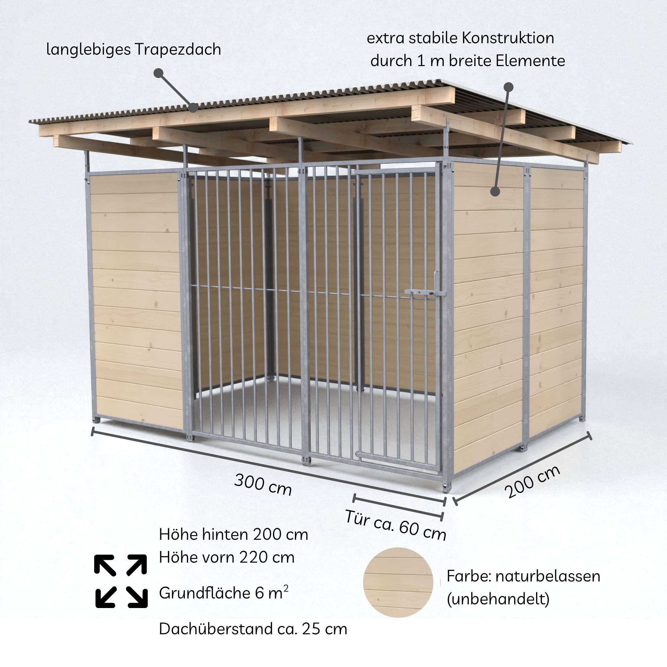 SAUERLAND extra STABIL Hundezwinger 2 x 3 m | 3,5-seitig geschlossen | naturbelassen | Rohrstab Abstand 8 cm