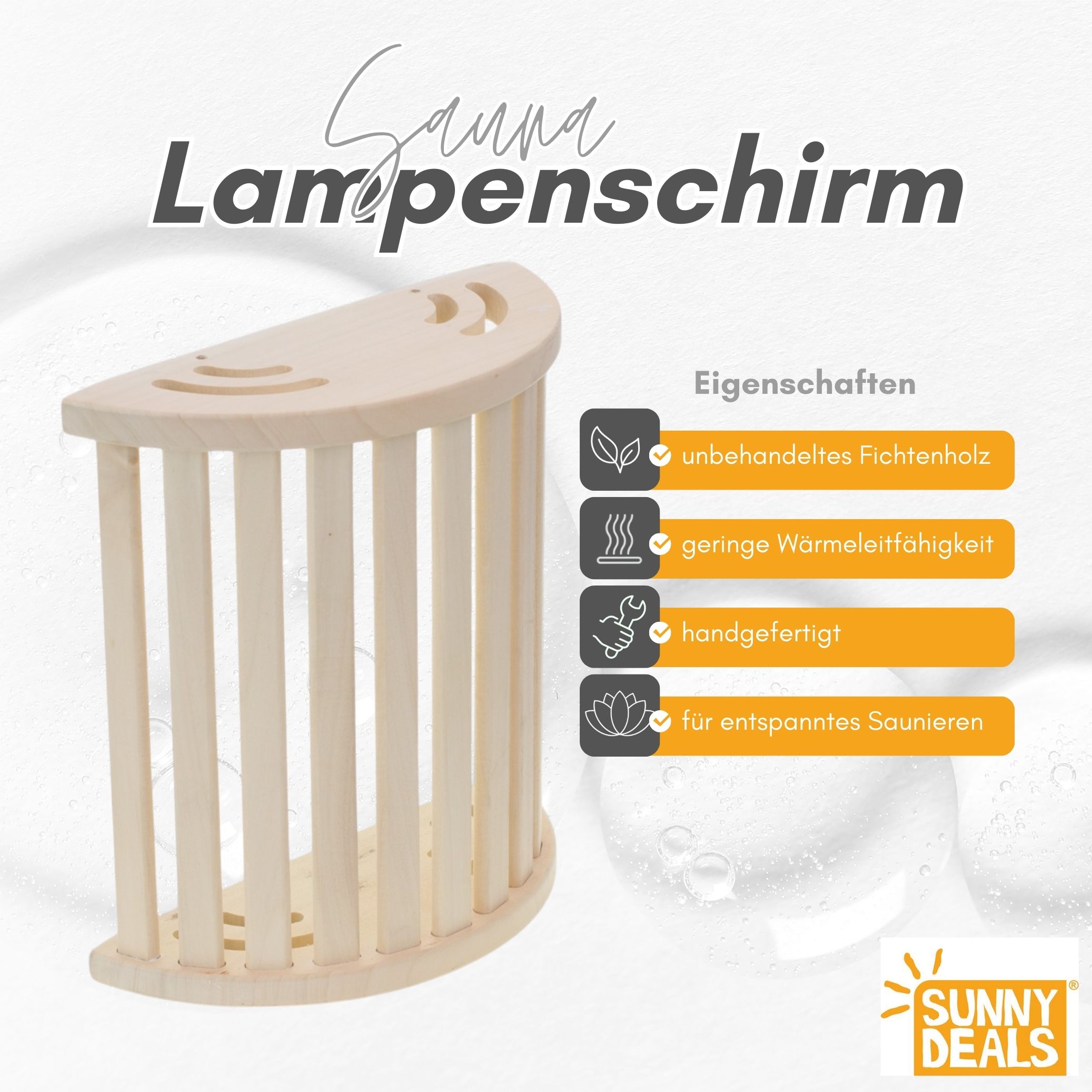 Genießen Sie wohltuendes Licht und ein harmonisches Saunaerlebnis mit unserem SunnyDeals® Sauna Lampenschirm aus Fichtenholz. Perfekt für alle, die Wert auf Qualität und Design legen!