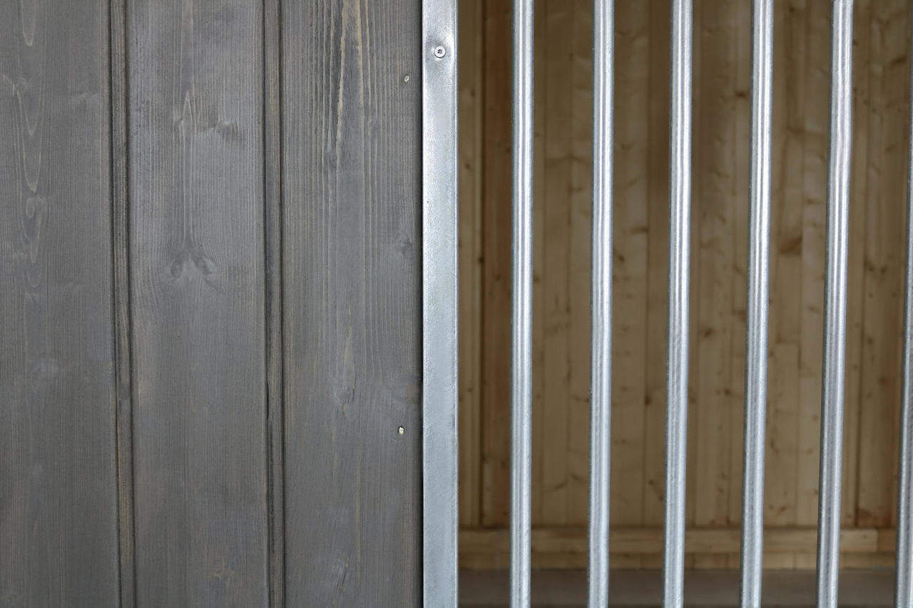 - bestehend aus 20 mm starken nordischen Nut- und Feder- Profilhölzern, Außenseite 2x Graphitgrau lasiert, Innenseite naturbelassen