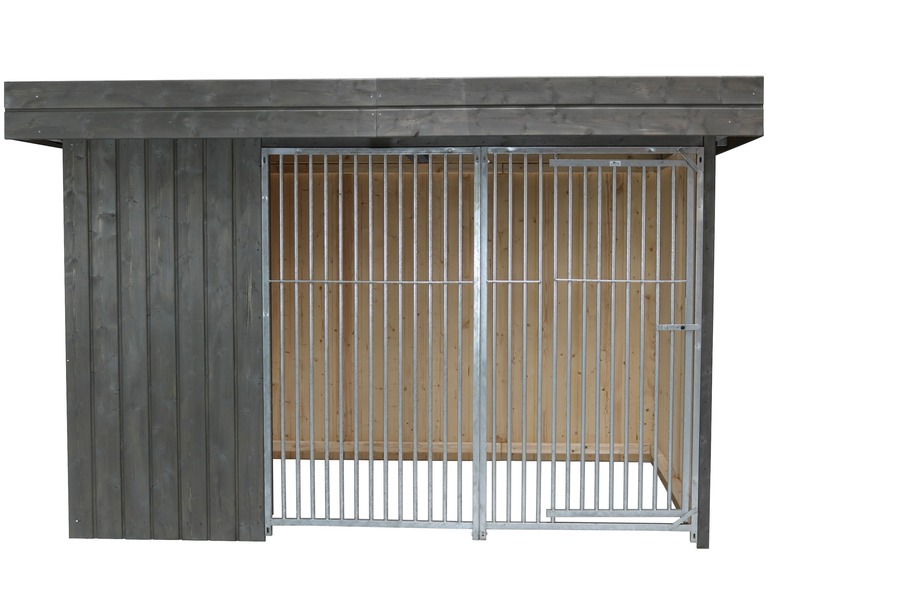 Hundezwinger (Bausatz) aus Holz mit Flachdachhttps://sauerlandshop.de/cogi-glossary/hover/7eafe89ca4e949028be613b6a19a84c3. Geschlossene Wände aus 20mm Massivholz, außen Graphitgrau. Rohrstabelement mit Tür in der Front, Rohrabstand 5 cm. (Ohne Boden, Hütte und Futterset).