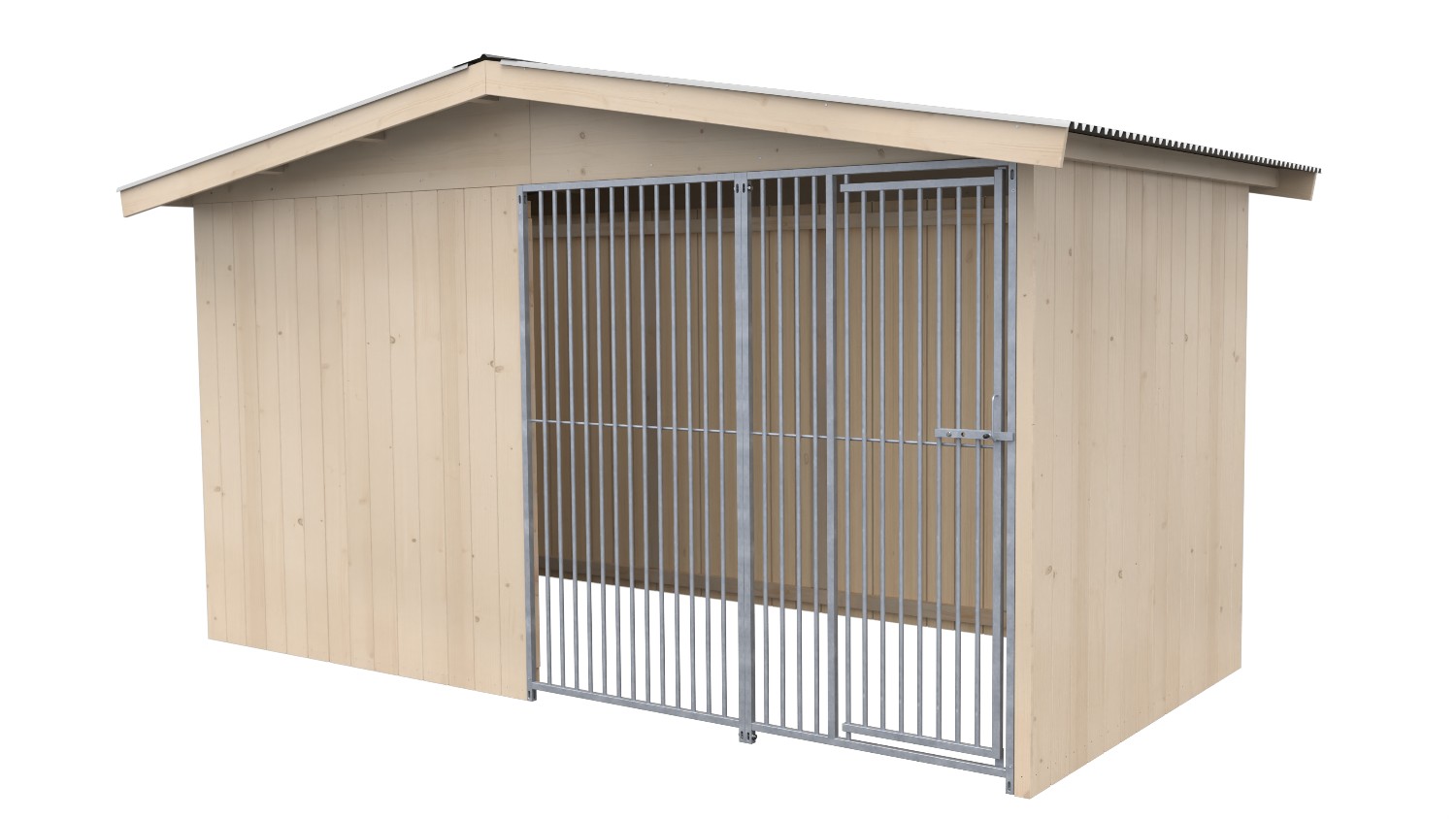 Hundezwinger (Bausatz) aus Holz mit Giebeldach. Geschlossene Wände aus 20mm Massivholz, naturbelassen. Rohrstabelement mit Tür in der Front, Rohrabstand 5 cm. (Ohne Boden, Hütte und Futterset).