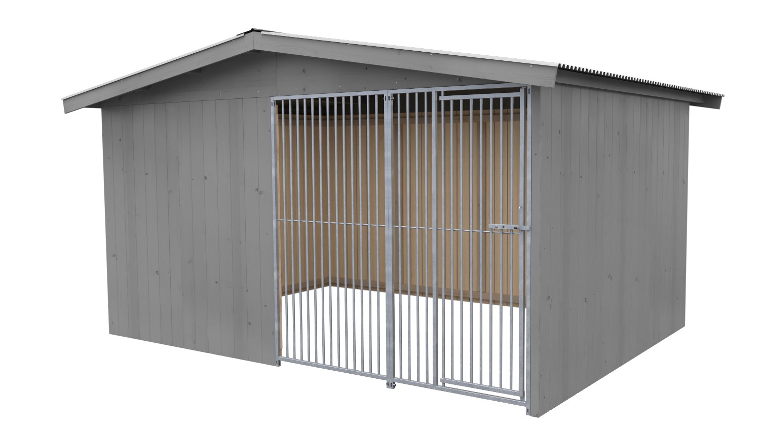 Hundezwinger (Bausatz) aus Holz mit Giebeldach. Geschlossene Wände aus 20mm Massivholz, außen Platingrau. Rohrstabelement mit Tür in der Front, Rohrabstand 5 cm. (Ohne Boden, Hütte und Futterset).