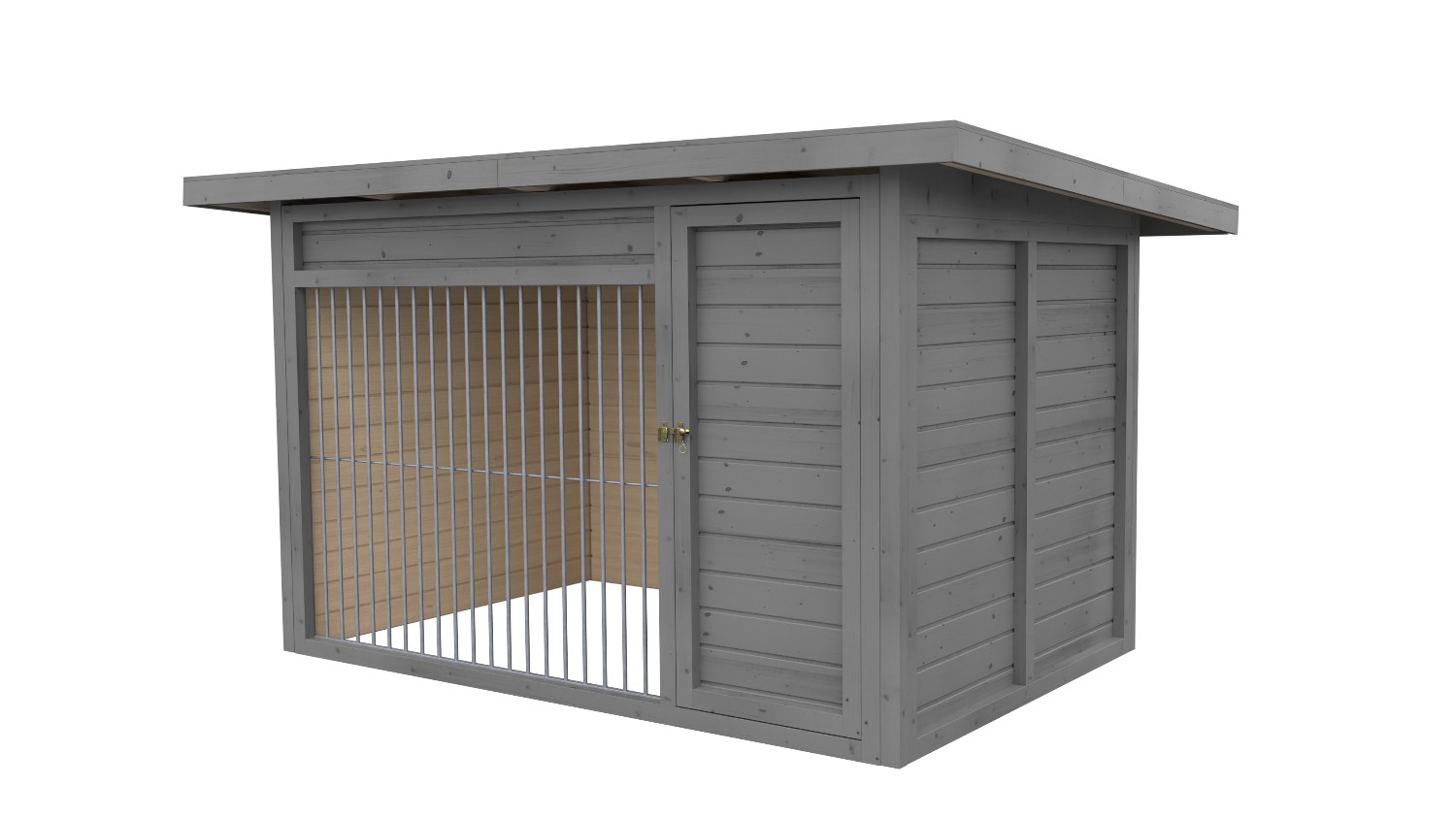 Exklusiver Zwinger aus Holz (Bausatz), mit Schrägdach, auf 3,5 Seiten geschlossen. Rohrabstand 8 cm.