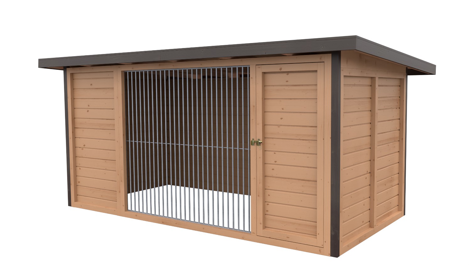 Exklusiver Zwinger aus Holz (Bausatz), mit Schrägdach, auf 3,5 Seiten geschlossen. Rohrabstand 8 oder 5 cm. (Ohne Boden, Hütte und Futterset)