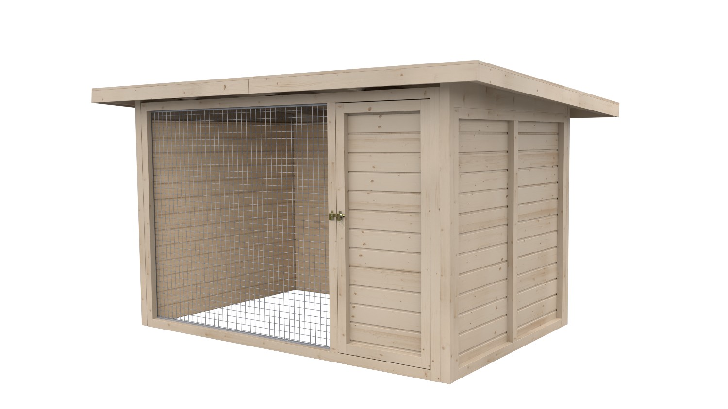 Exklusiver Zwinger aus Holz (Bausatz), mit Schrägdach, auf 3,5 Seiten geschlossen. Gitterelemente mit 4 mm Gitterstäben und einer Maschenweite von 5x5 cm in der Front.