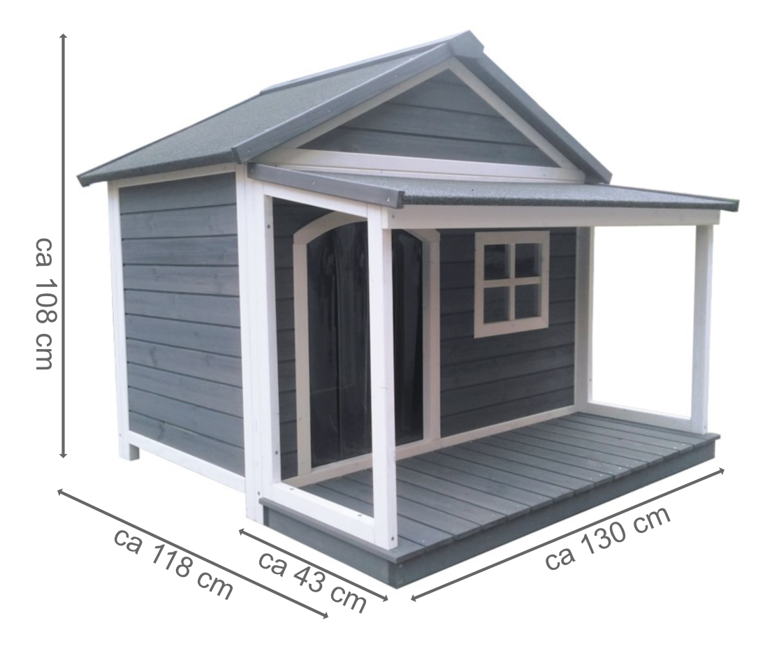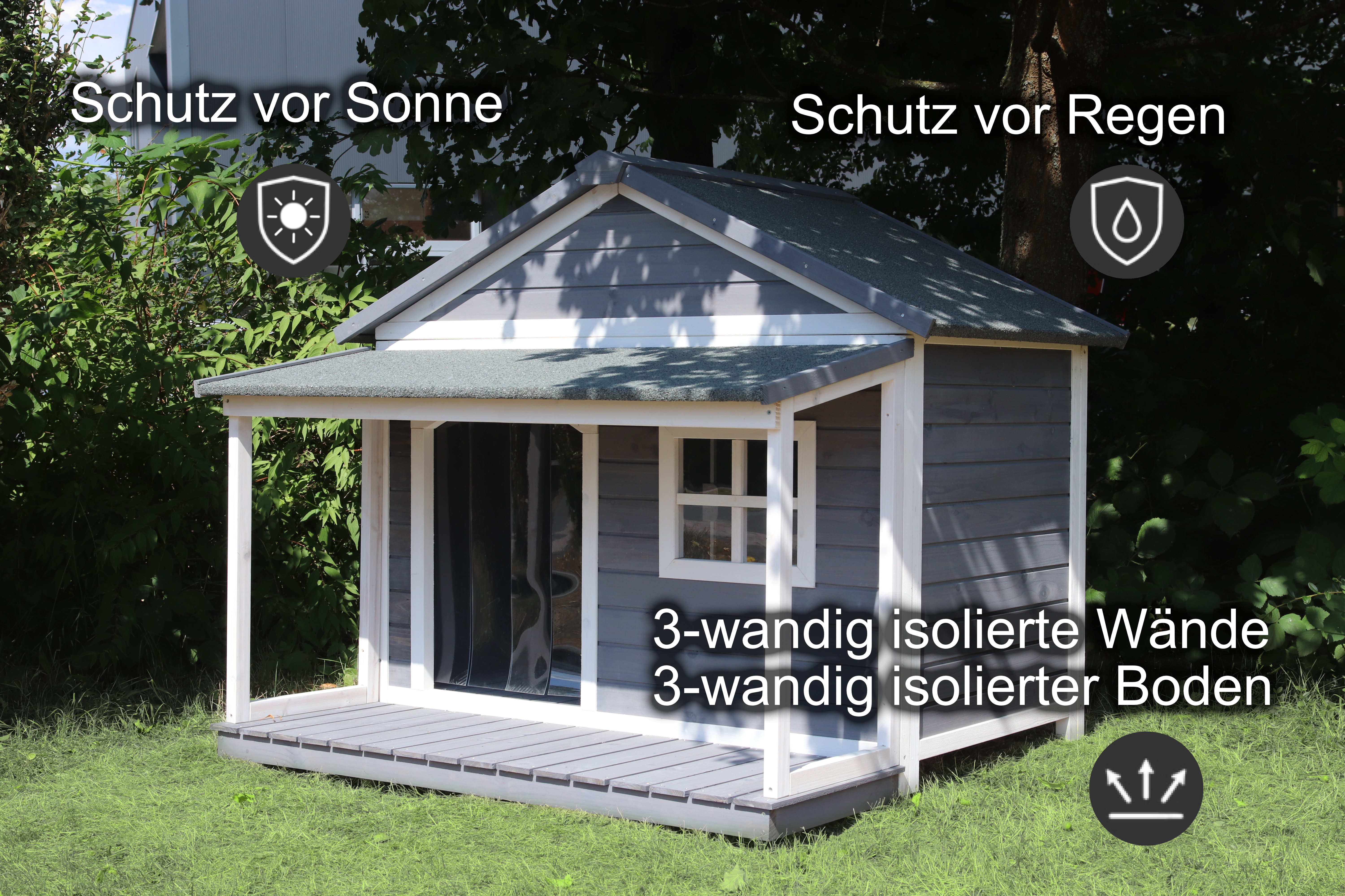 Holz-Hundehütte mit Satteldach und Veranda, grau-weiß lasiert, wetterfest